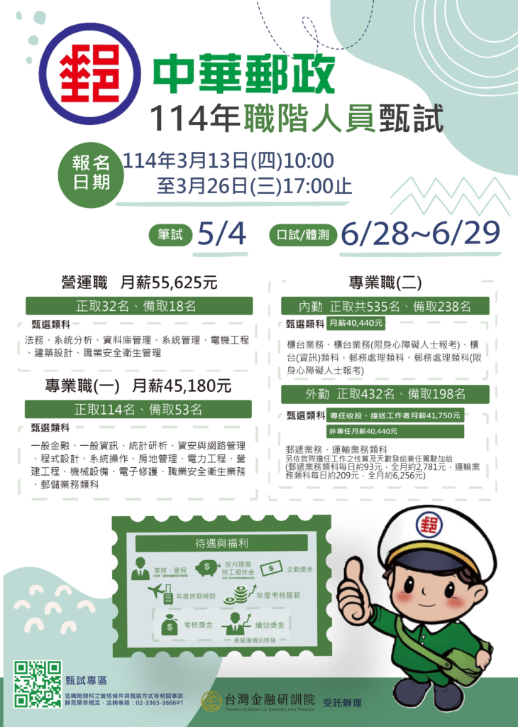 一、「中華郵政股份有限公司114年職階人員甄試」預計正取1,113名,備取507名: