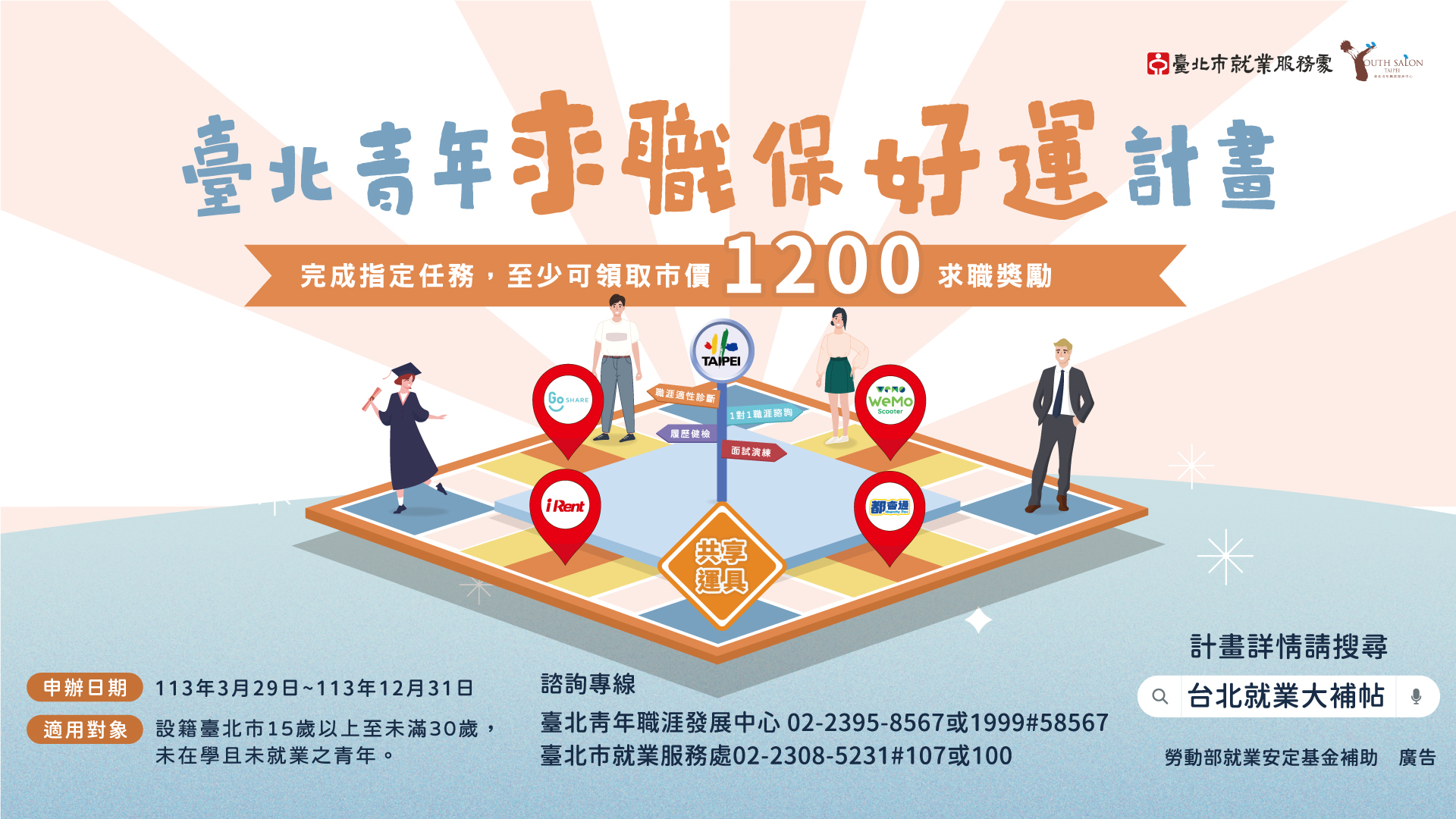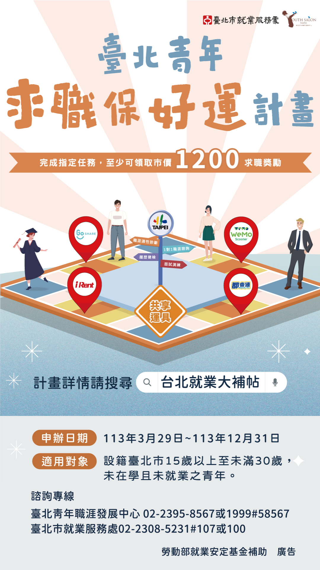 臺北市3/29推出青年求職保好運計畫,線上申請並完成指定任務即領取1,200以上共享運具折價券或大眾運輸工具補助!設籍北市未就學且未就業15至29歲青年朋友心動不如馬上行動,臺北市助您尋職暢行無阻!