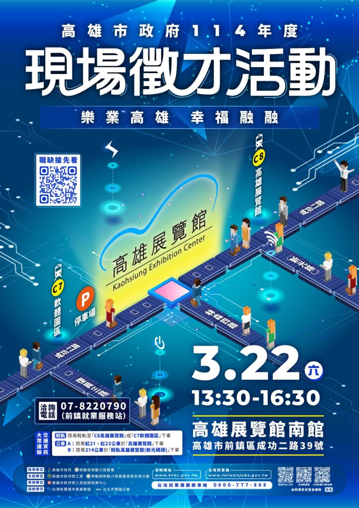 高雄市政府勞工局將於3月22日(六)下午13:30-16:30在高雄展覽館南館(高雄市前鎮區成功二路39號)舉辦中大型現場徵才活動。31家廠商,近1000個工作機會!