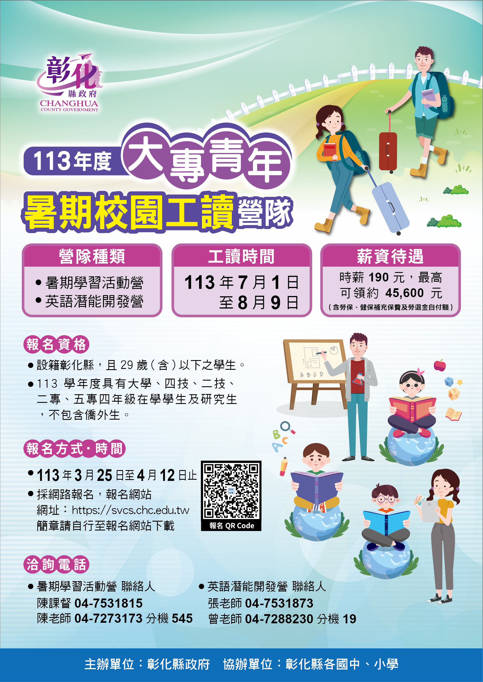 一、為提供設籍彰化縣大專青年學生暑期工讀機會,一方面運用所學返鄉服務,另一方面協助其從工作中建立正確的工作習慣及價值觀,以為未來正式踏入職場做充分準備,特辦理本工讀。