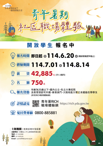 二、檢附本計畫開放學生報名DM如附件,並可至教育部青年署「RICH職場體驗網」(rich.yda.gov.tw)-暑期社區職場體驗-職缺列表查詢相關職缺及投遞履歷。體驗期間為7月1日至8月14日止,由教育部青年署提供每人每月薪資28,590元;1.5個月合計42,885元。