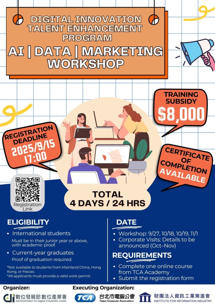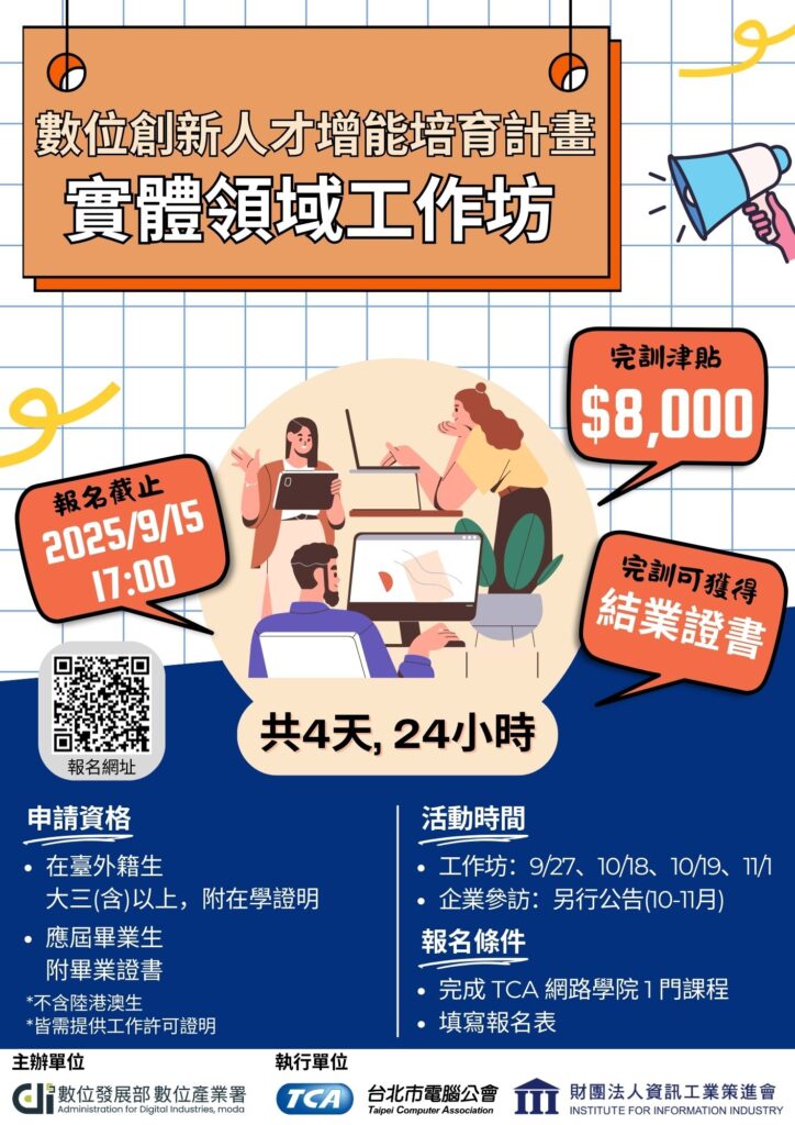 二、研習期程:114年9月27日、10月18日、10月19日、11月1日等,詳見附件「2025年數位創新人才增能培育計畫研習申請須知」與計畫粉絲專業最新消息。