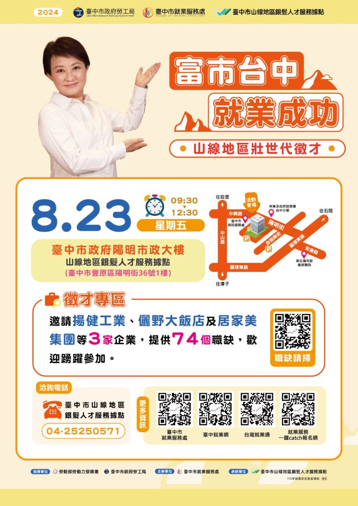 臺中市政府壯世代徵才活動將於8月23日於豐原陽明市政大樓1樓登場,揚健工業、儷野大飯店、皇居服務事業等3家企業提供多元職缺,洽詢請撥04-25250110臺中市山線地區銀髮人才服務據點。