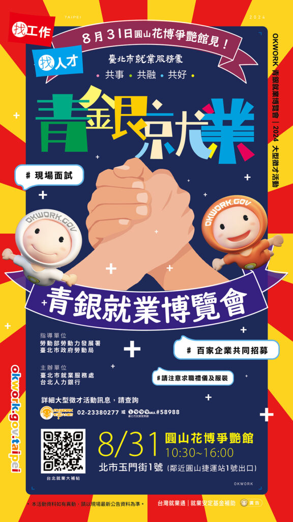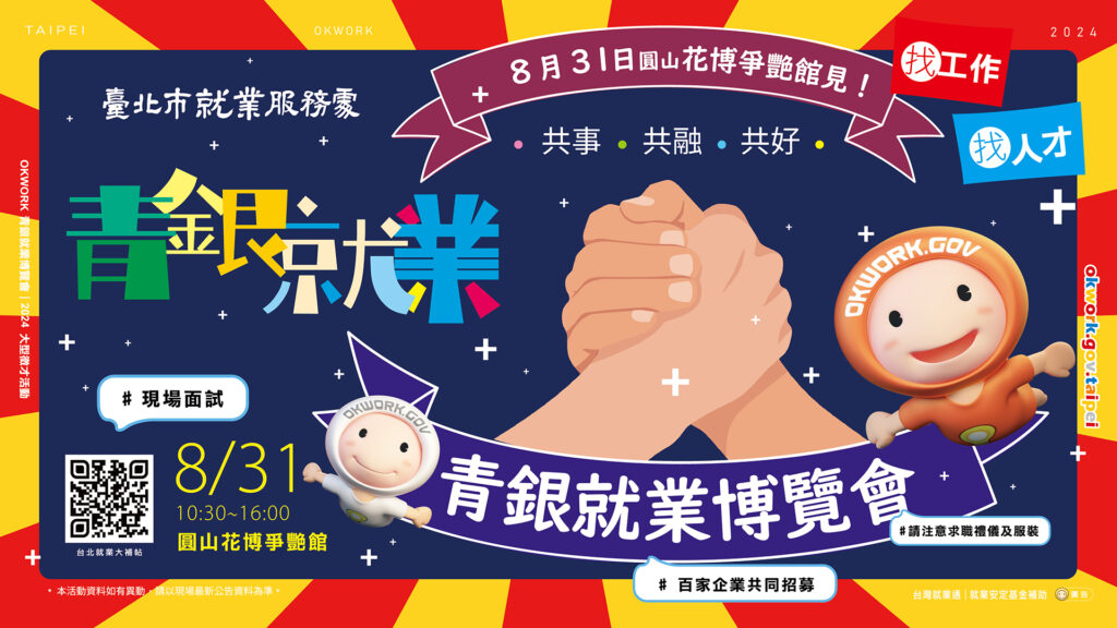 臺北市政府8月31日(六)10點30分起於花博公園爭艷館辦理青銀就博會,194家企業提供近萬個工作機會,眾多職缺優於勞基法,月薪3萬元起無工作經驗亦可,更多詳情資訊請搜尋台北就業大補帖網站,歡迎前往參加!