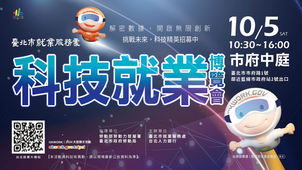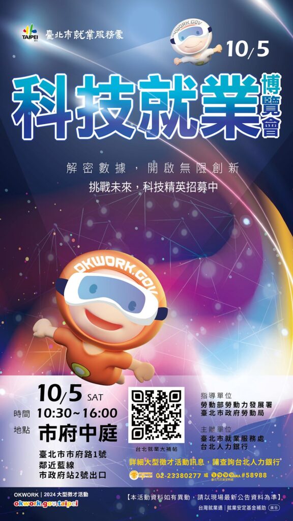 臺北市就業服務處10/5(六)上午10時30分至下午4時在臺北市政府1樓中庭(信義區市府路1號)舉辦科技就業博覽會,52家優質廠商提供2219個工作機會,詳情資訊可搜尋台北就業大補帖網站或電洽(02)2308-5231。