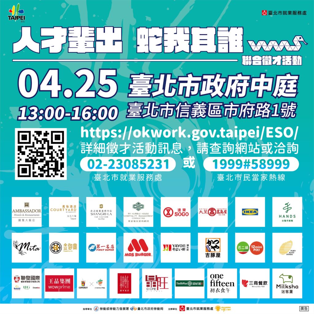 臺北市就業服務處4月25日(五)13時至16時在北市府1樓中庭(臺北市信義區市府路1號)舉辦人才輩出蛇我其誰聯合徵才活動,現場面試提供1,230個優質工作機會,詳情搜尋台北就業大補帖網站或電洽(02)2308-5231。