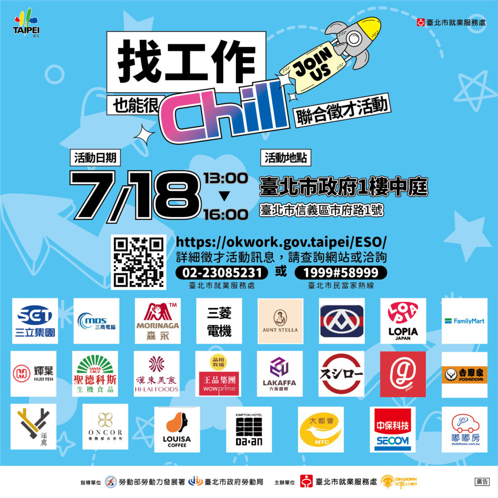 臺北市就業服務處7月18日(五)13時至16時在北市府1樓中庭舉辦「找工作也能很Chill」聯合徵才活動,現場面試提供1,800個工作機會,詳情請搜尋台北就業大補帖網站或電洽(02 )2308-5231。