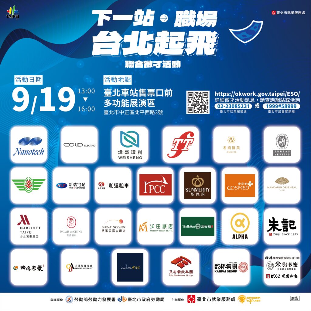 臺北市就業服務處114年9月19日「下一站職場‧台北起飛」聯合徵才活動 2025-09-02 SystemAdmin 臺北市就業服務處9月19日(五)13時至16時在臺北車站1樓大廳,舉辦「下一站職場‧台北起飛-徵才活動」,現場面試、提供814個工作機會,詳情搜尋台北就業大補帖網站或電洽(02)2308-5231。