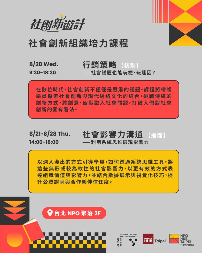 一、臺北市政府青年局支持青年投入社會創新工作,並鼓勵建立和發展社會創新組織,推出社會創新組織培力課程,幫助青年朋友將創新想法轉化為可行方案,提升社會影響力。