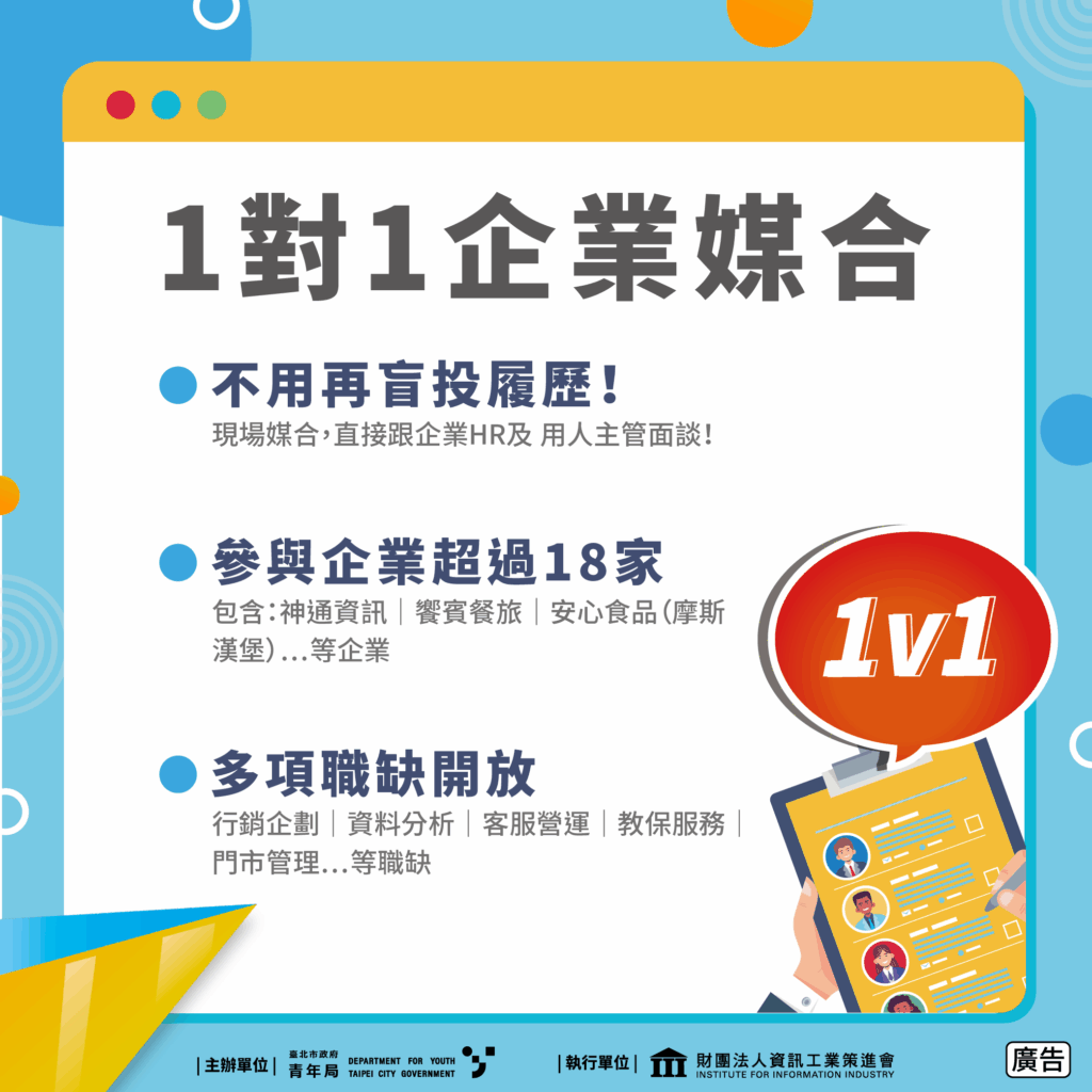 (一)活動宗旨:網羅國內外廠商聯合徵才,提供多元化之領域職缺,邀請剛進入職場的社會新鮮人、即將投入職場的青年學子,與知名企業進行一對一面談,促進求職者與徵才企業媒合,推動臺北青年就業。