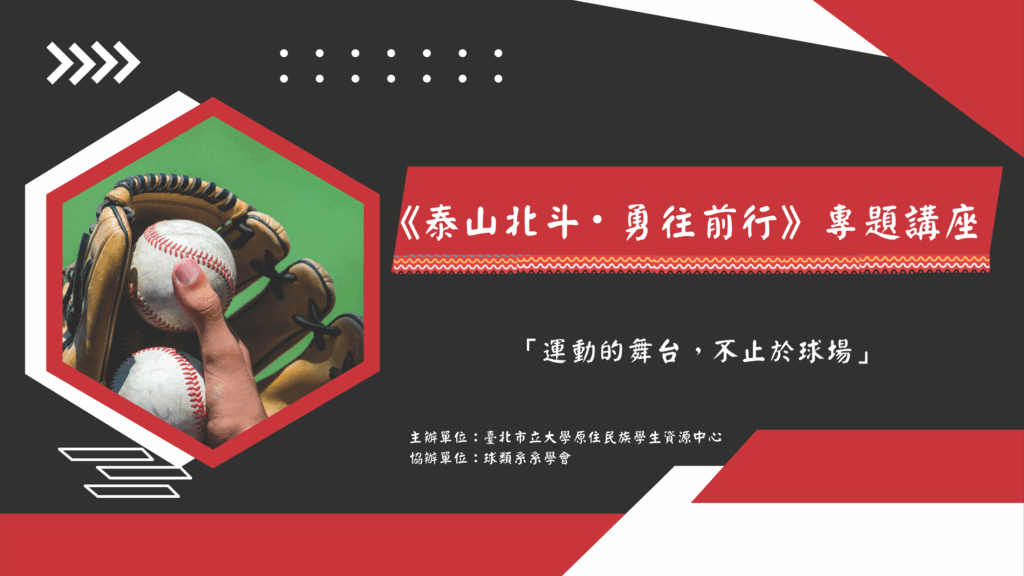 一、臺北市立大學原住民族學生資源中心舉辦本次講堂,特邀前職棒球星張泰山教練進入校園,與大學生展開生命對話,分享其運動職涯歷程與文化認同思維。