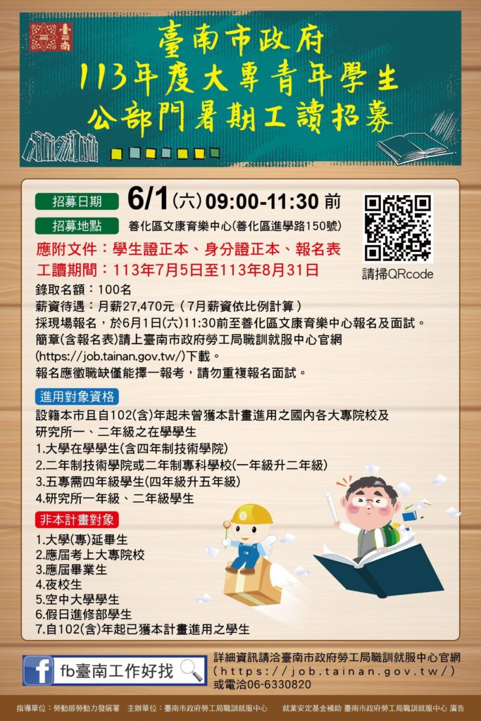 臺南市政府勞工局於6月1日(六)上午9點至11點30分在善化區文康育樂中心(臺南市善化區進學路150號)辦理「113年度大專青年學生公部門暑期工讀計畫」招募活動,提供100個工讀機會,當日辦理現場報名及公開面試,歡迎設籍臺南市之大專院校以上在學學生踴躍報名參加,面試當天於善化火車站前提供免費接駁專車往返於活動會場,請求職民眾多加利用,相關問題詳洽:06-6330820。