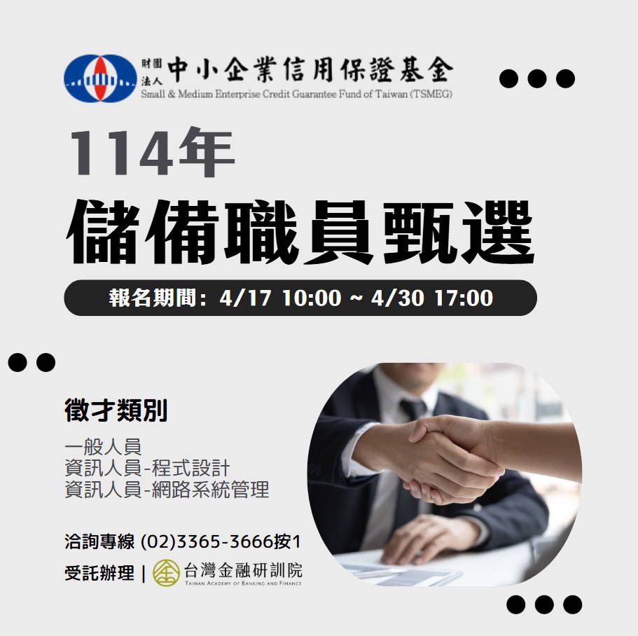 一、財團法人中小企業信用保證基金114年儲備職員甄選,合