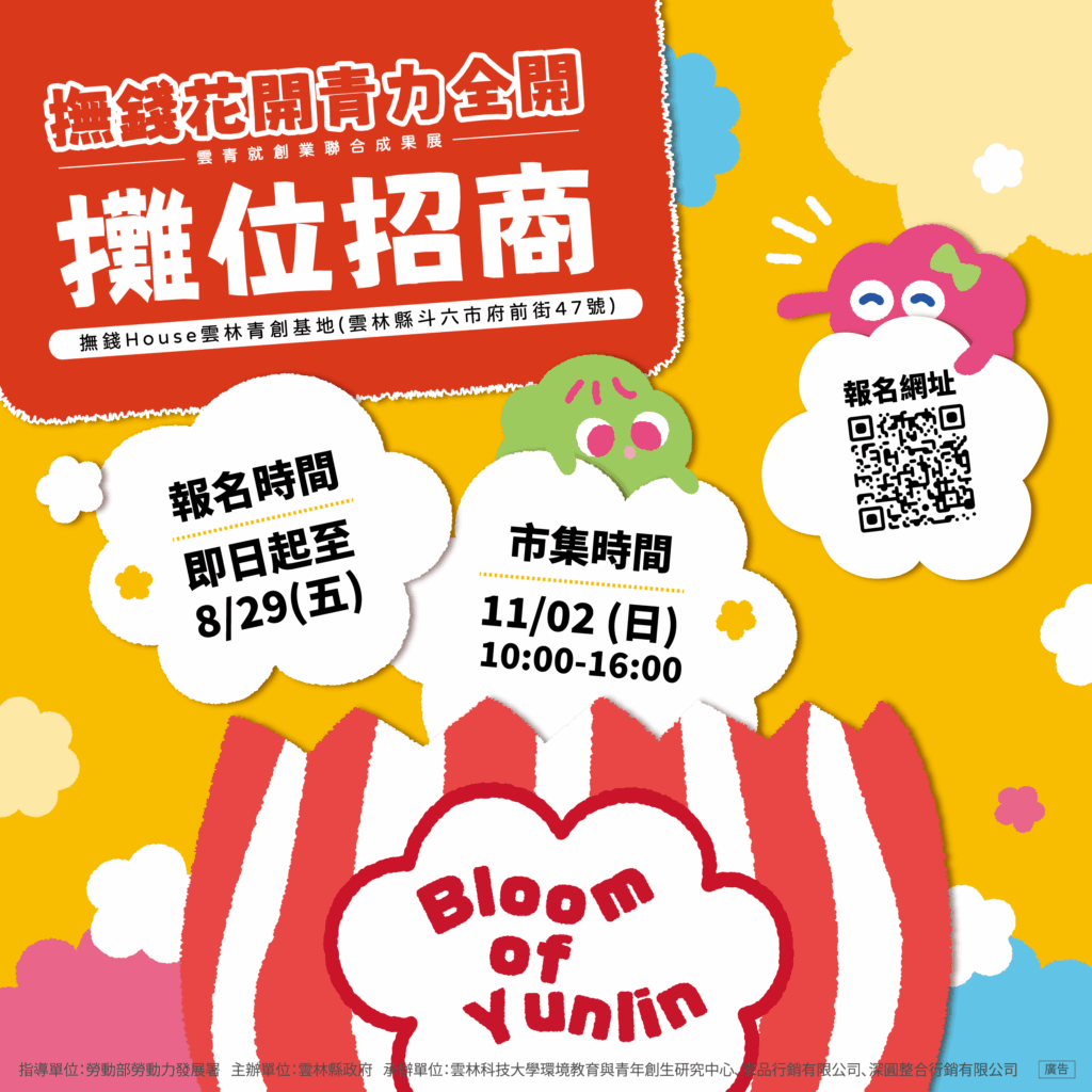 一、雲林縣政府為凝聚雲林縣創業能量並協助雲林縣創業青年品牌曝光,辦理「Bloom of Yunlin雲青就創業聯合成果展」活動,並自即日起進行攤位招商,說明如下: