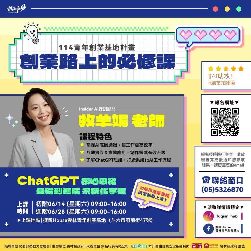 一、雲林縣政府為協助在地青年及創業家充實AI數位工具應用能力,辦理一系列創業路上的必修課,提供雲林創業家學習AI工具的近便性,本次活動資訊如下: