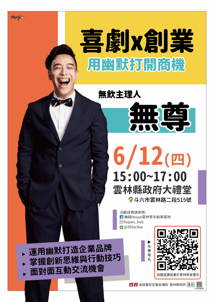一、雲林縣政府為協助在地青年及創業家實現創業夢,特別邀請雲林縣創業大使-「無尊」分享從演藝圈跨足創業的心路歷程: