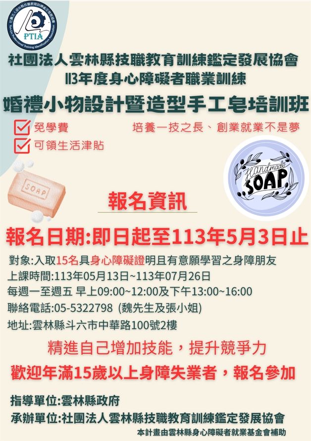 雲林縣113年度身心障礙者職業訓練「婚禮小物設計暨造型手工皂培訓班」招生簡章乙份,請踴躍報名參訓,謝謝。