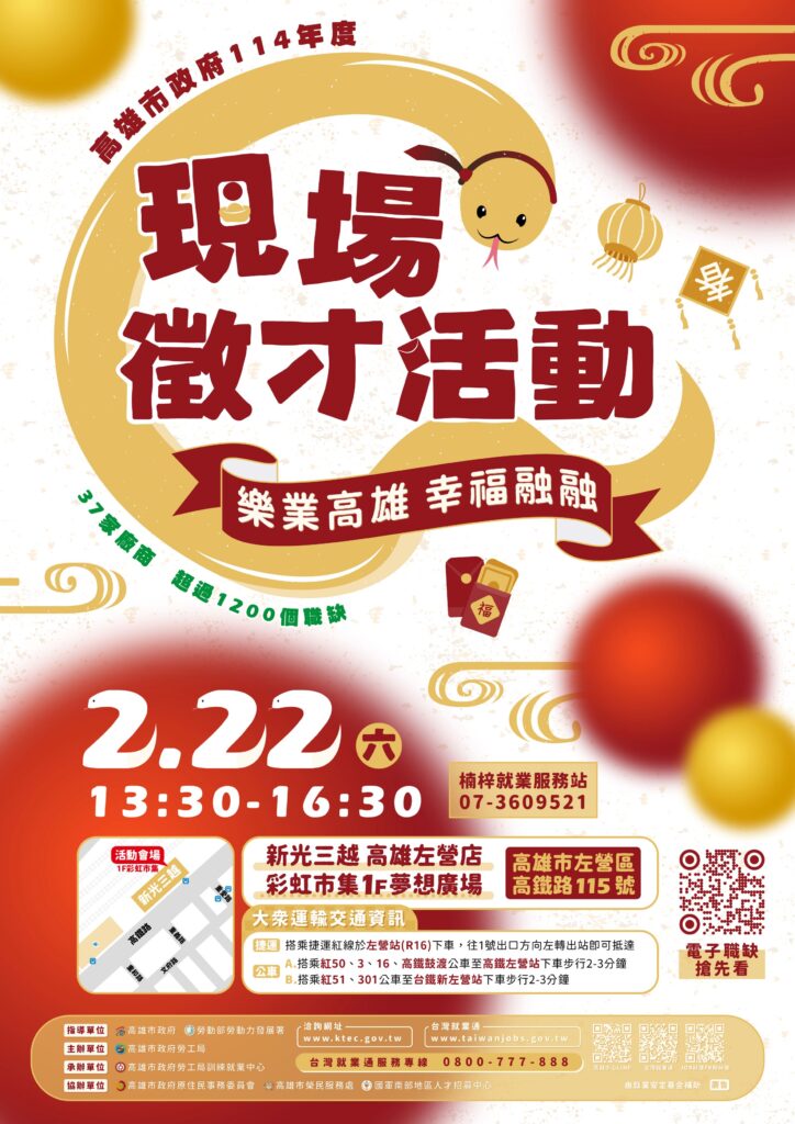 高雄市政府勞工局將於2月22日(六)下午13:30-16:30在新光三越高雄左營店彩虹市集1樓夢想廣場(高雄市左營區高鐵路115號)舉辦大型現場徵才活動。