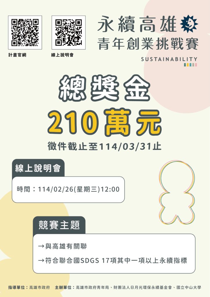 一、為挖掘具潛力青創團隊,高雄市政府青年局整合產官學資源辦理旨揭創業競賽,結合聯合國永續發展指標(SDGs)議題,聚焦AI科技應用與淨零等主軸,以徵件形式鼓勵青年發揮創新創意,輔以賽後完整培訓及產業對接機制,加速扶植青創事業發展。