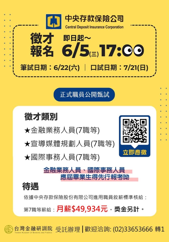 一、「中央存款保險公司113年進用正式職員公開甄試」,預計合計正取8名,備取24名。