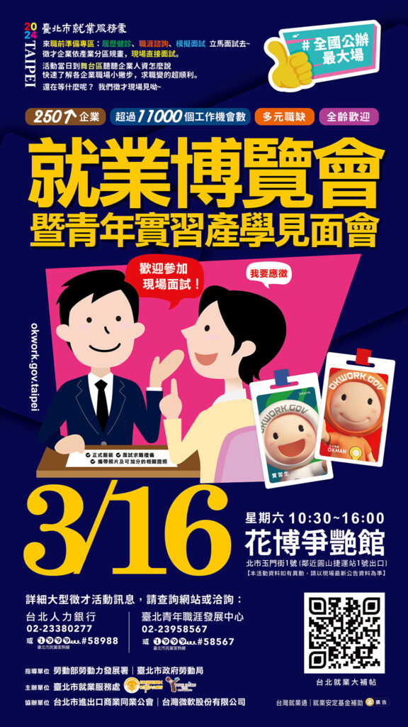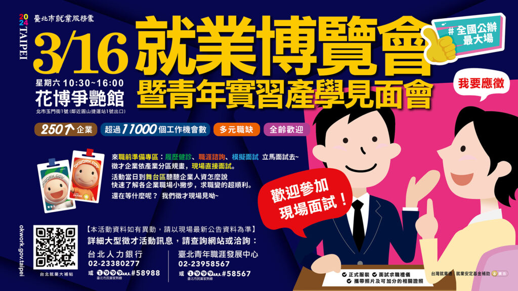 就業博覽會暨青年實習產學見面會3月16日(六)10時30分起在圓山花博爭艶館現場面試搶人才,眾多職缺優於勞基法,詳細職缺內容請搜尋「台北就業大補帖」官網或電洽02-23380277,歡迎求職朋友們踴躍參與!