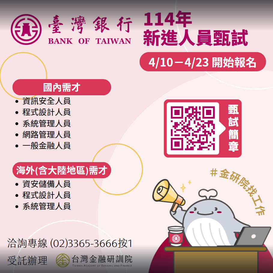 一、「臺灣銀行114年新進人員甄試」預計正取134名,備取51名: