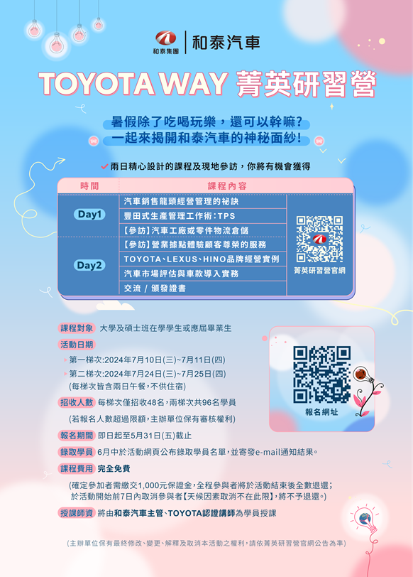 | 報名連結 | 2024年和泰汽車TOYOTA WAY菁英研習營報名表單*科系、年級皆不限,應屆畢業生也歡迎報名 |