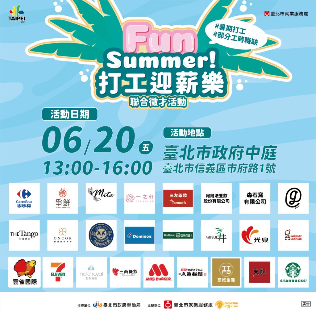 臺北市就業服務處6月20日(五)13時至16時在北市府1樓中庭舉辦「FUN SUMMER打工迎薪樂」聯合徵才活動,現場面試提供1,243個工作機會,詳情請搜尋「台北就業大補帖」網站或電洽(02)2308-5231。