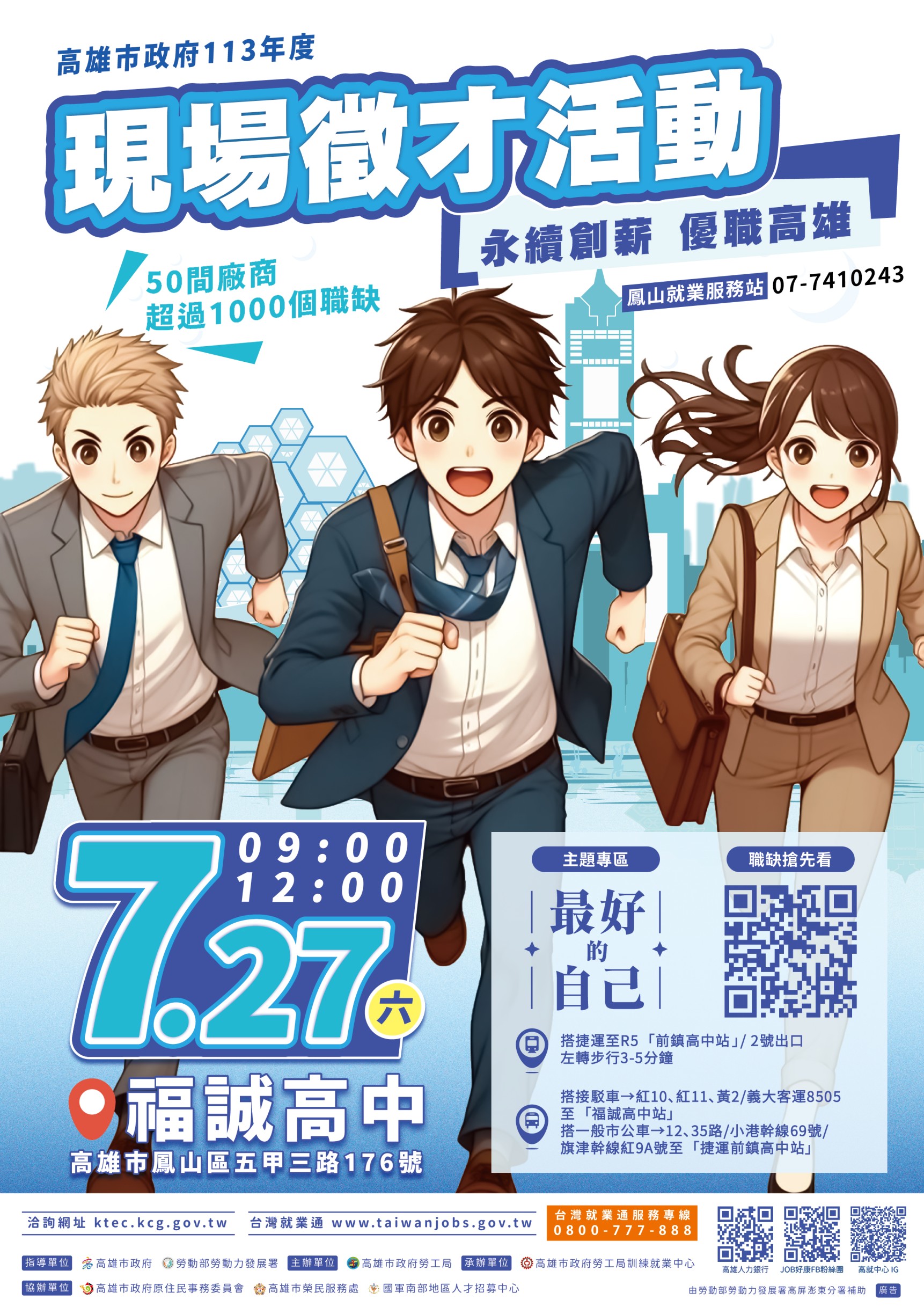 113.07.27(六)高雄市政府勞工局訓練就業中心辦理現場徵才活動 2024-07-16 SystemAdmin 活動名稱:「永續創薪 優職高雄」現場徵才活動 活動時間:113年7月27日(六)上午09:00-12:00 活動地點:福誠高中活動中心(高雄市鳳山區五甲三路176號) 現場邀請52家廠商,提供逾1,600個職缺。