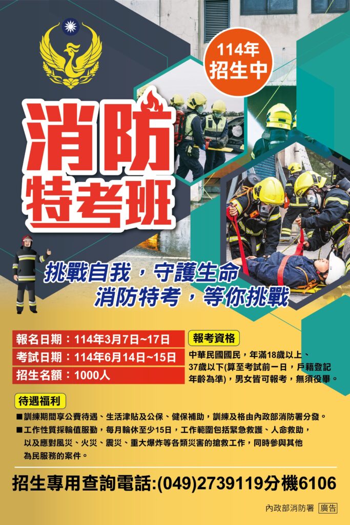 114年消防特考班招生宣傳海報 2025-03-04 SystemAdmin 一、114年消防特考班招生名額計1000名,報名日期自114年3月7日至17日止。 二、為期招募優秀青年投入消防工作行列,請有興趣者踴躍報考。