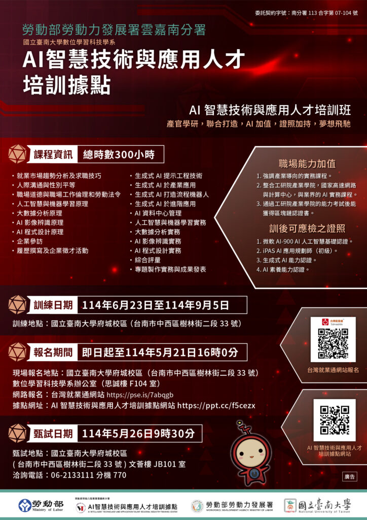 1、培訓時間:114年6月23日至114年9月5日,共300小時。