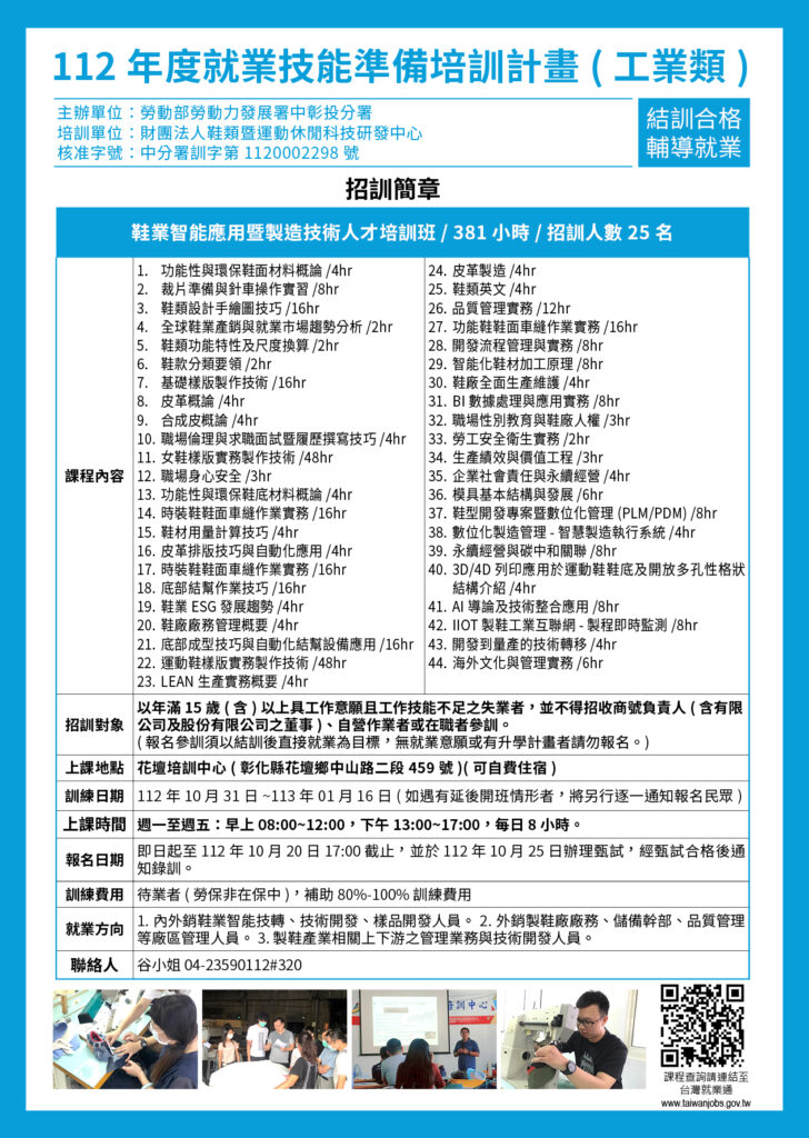 一、旨揭課程為勞動部勞動力發展署中彰投分署委辦之職前訓練計畫,讓有興趣加入製鞋產業之優秀人才,先對製鞋產業價值鏈有充分的了解與體驗,進而投入職場,增加未來職涯發展的穩定性。