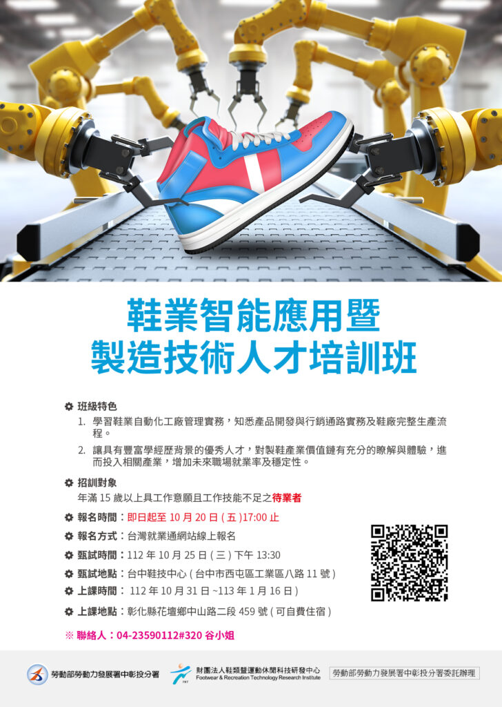 三、報名方式及相關資訊:請參考附件,或財團法人鞋類暨運動休閒科技研發中心人才培訓網頁。(https://reurl.cc/Oj4W19)