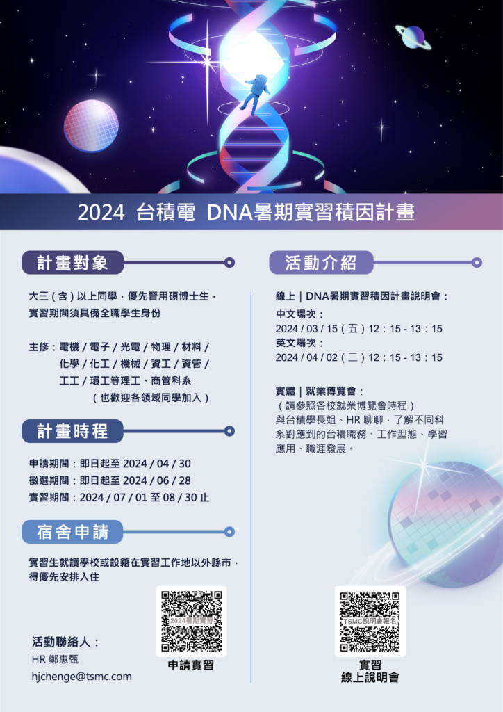 2024年「台積電暑期實習-DNA積因計畫」已開跑,對象為2024年大三(含)以上學生,竭誠歡迎同學申請!