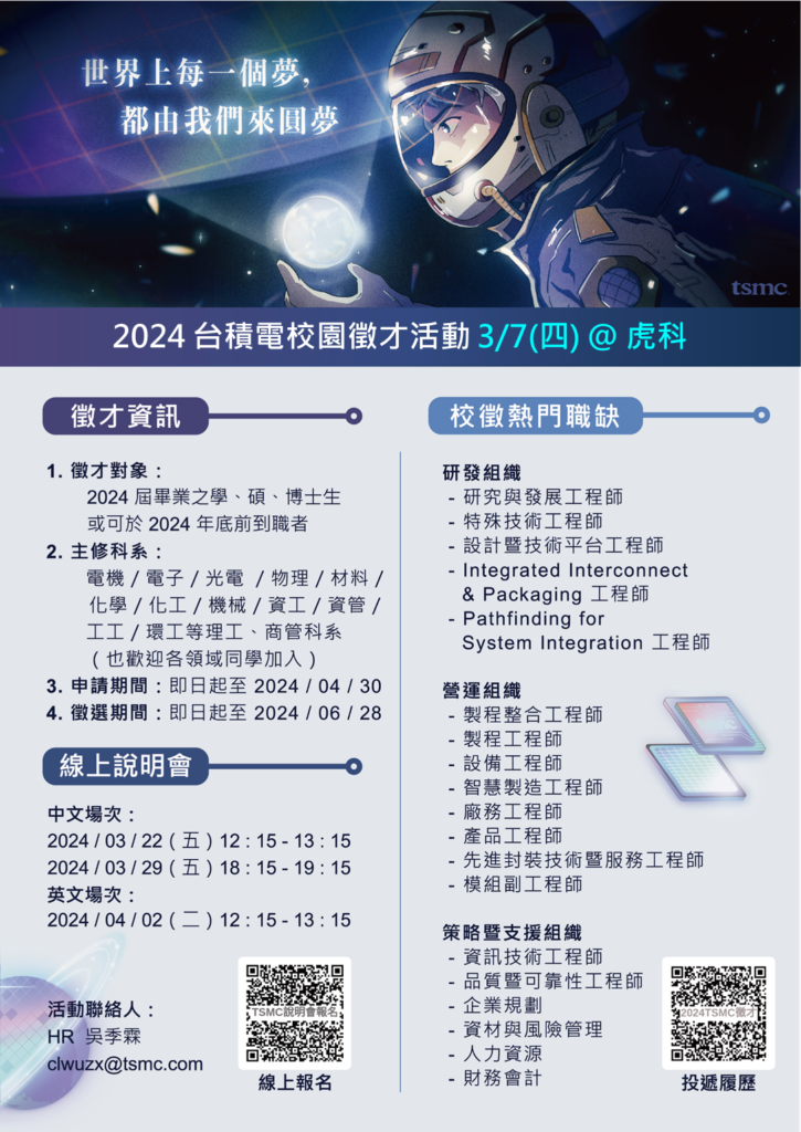 • 線上|徵才說明會:如您當天無法參與實體徵才說明會,也歡迎報名參加台積自辦之線上徵才說明會,以掌握台積趨勢、職缺資訊及履歷投遞!