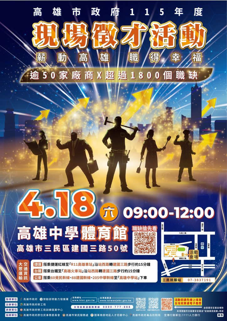 高雄市政府勞工局將於4月18日(六)上午09:00至12:00於「高雄中學體育館」(高雄市三民區建國三路50號)舉辦大型現場徵才活動,敬請把握機會!
